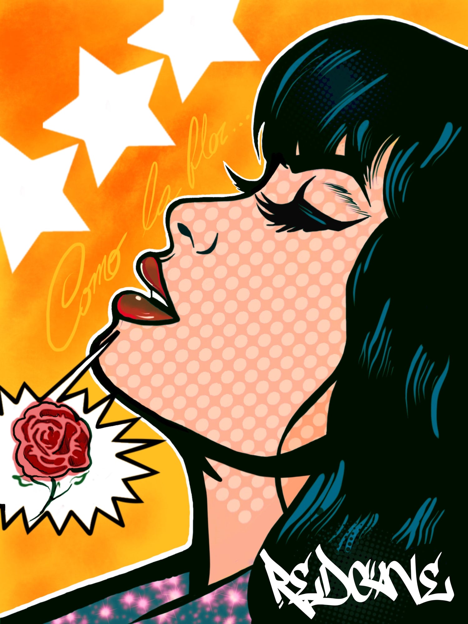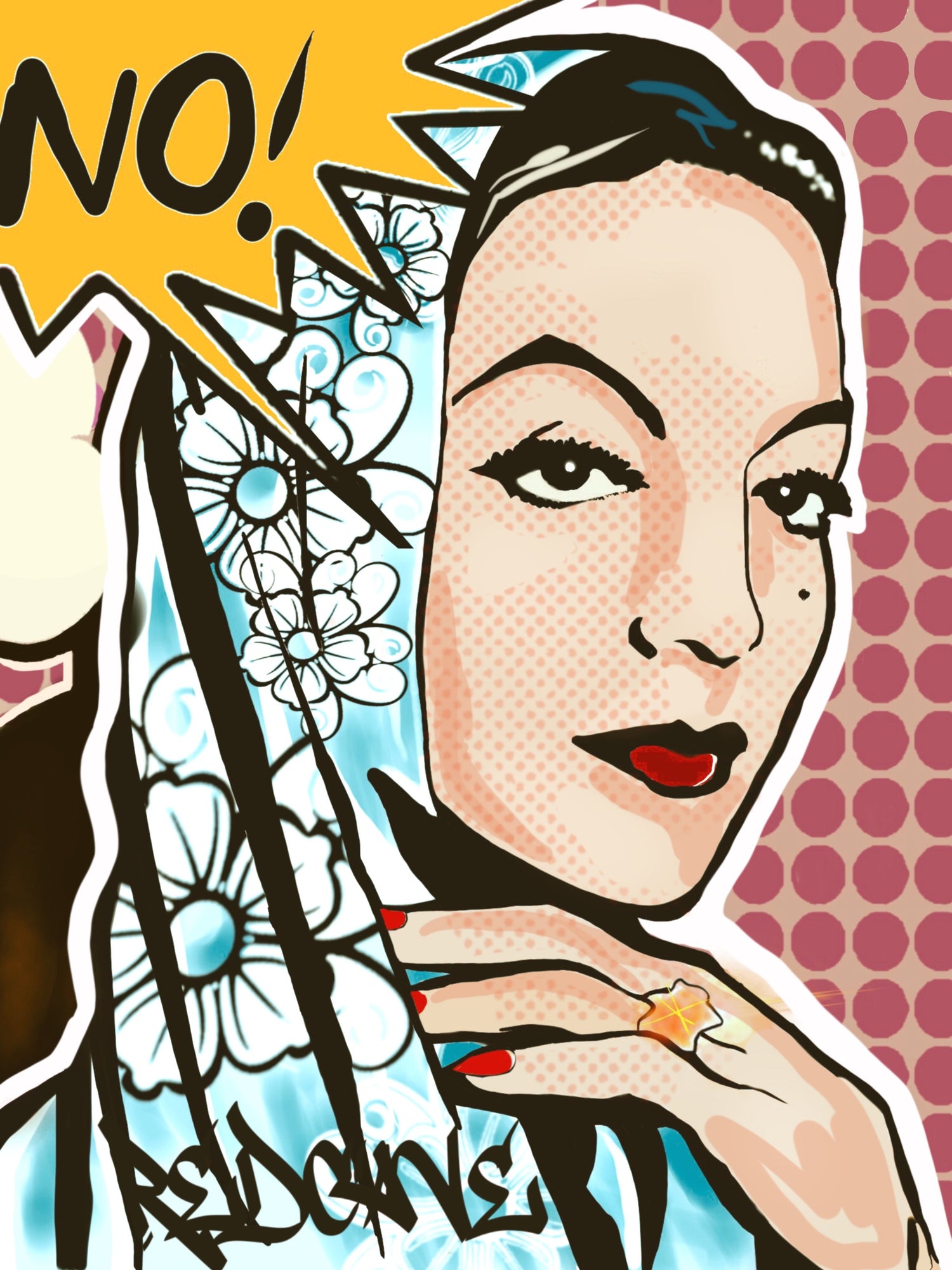 This pop art illustration emphasizes the famous Mexican actress and singer, Maria Felix. She is considered to be one of the most successful figures in the late 1940's and 1950's in Latin American Cinema. In the illustration, the word "NO!" highlights the strong women empowerment Felix had during a time where women held traditional roles. Felix was a pioneer in the feminist movement that inspired many.